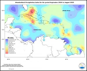 During the month of August, conditions were mostly normal to below normal throughout the eastern Caribbean. Trinidad was exceptionally wet to moderately dry southeast to northwest; Tobago normal to moderately dry; Grenada, St Vincent exceptionally dry; Barbados extreme to moderately dry; Saint Lucia moderate to exceptionally dry; Martinique and Dominica exceptional to extremely dry; Guadeloupe predominantly extreme to severely dry; Antigua and St Kitts slightly dry to mostly normal; St Maarten normal to moderately wet; Anguilla moderate to exceptionally wet and St Thomas mostly normal to slightly wet. In the Guianas, conditions were mostly normal ranging to severely dry in northeastern Guyana and French Guiana and to extremely wet in northeastern Suriname. Curacao was normal. Puerto Rico ranged from exceptionally dry in the south to exceptionally wet in the north. The Dominican Republic ranged from normal to exceptionally dry west to east. Jamaica was mostly normal, but slightly dry in the west. Grand cayman was slightly wet. Cuba was mostly normal ranging to moderately wet in the west and to moderately dry in the east. Northern Bahamas was predominantly normal ranging to slightly dry and Belize was normal to severely dry.
