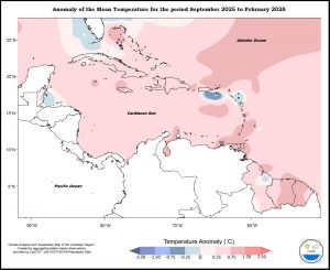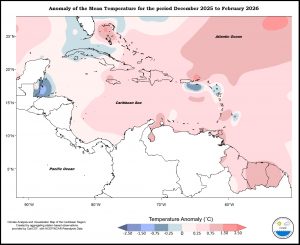 Mixed temperature anomalies were experienced over the three month period across the eastern Caribbean. Trinidad was between 0.75 and 1.50 o C warmer; Tobago, Grenada, Martinique and St Maarten between 0.25 and 0.75 o C warmer; Barbados between 0 and 1.50 o C warmer; Saint Lucia between 0 and 0.75 o C warmer; Dominica between 0 and 0.25 o C warmer; Guadeloupe and St Kitts between 0.25 warmer to 0.25 o C cooler; Antigua between 0 and 0.25 o C cooler; St Croix 0 to predominantly between 0.75 and 0.25 o C cooler and St Thomas between 0.75 and 2.50 o C warmer. In the Guianas, temperatures were between 0 and 1.50 o C warmer. Aruba was between 0.75 and 1.50 o C warmer. Puerto Rico was between 0.75 cooler and 0.75 o C warmer southeast to northwest. The Dominican Republic was within 0.25 and 0.75 o C warmer. Jamaica was within 0.25 and 1.50 o C warmer. Northern Bahamas was between 0 and 2.50 o C warmer and Belize 1.50 cooler to 0.75 o C warmer.