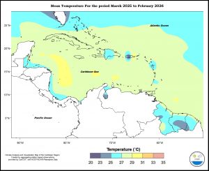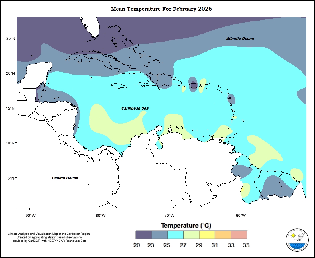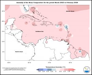 Temperature anomalies across the eastern Caribbean were mostly warmer than average during the month of February. Trinidad and Saint Lucia were between 0.25 to 1.5 o C warmer than average; Tobago , Martinique and St Maarten between 0.25 and 0.75 o C warmer; Grenada and St Thomas between 0.75 and 1.50 o C warmer; Barbados between 0 and 1.50 o C warmer; Dominica between 0 and 0.75 o C warmer; Guadeloupe between 0.75 warmer in the south to 0.25 o C cooler in the north ; Antigua between 0 and 0.25 o C cooler; St Kitts between 0 and 0.25 o C warmer and St Croix between 0.25 and 1.50 o C cooler. In the Guianas, temperature anomalies were between 0 and 1.50 o C warmer, though predominantly between 0.25 and 0.75 o C warmer. Aruba was within 0.75 and 2.5 o C warmer. Puerto Rico was between 0.75 cooler and 0.75 o C warmer southeast to northwest. The Dominican Republic was mostly between 0 and 0.25 o C warmer ranging to 0.75 o C warmer in the east and to 0.25 o C cooler on the extreme northwestern coastline. Jamaica was between 0.25 warmer and 0.25 o C cooler. Northern Bahamas was between 0.75 cooler and 0.75 o C warmer and Belize was between 0.25 and 1.50 o C cooler.