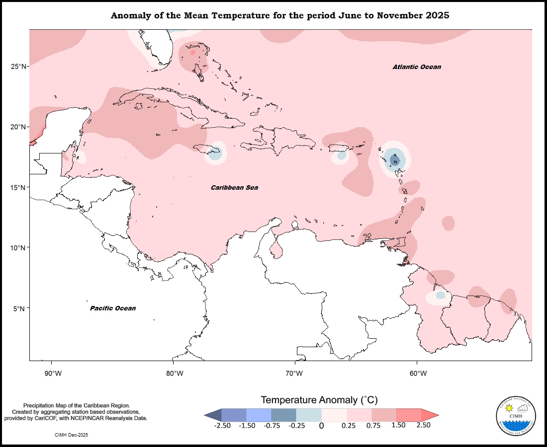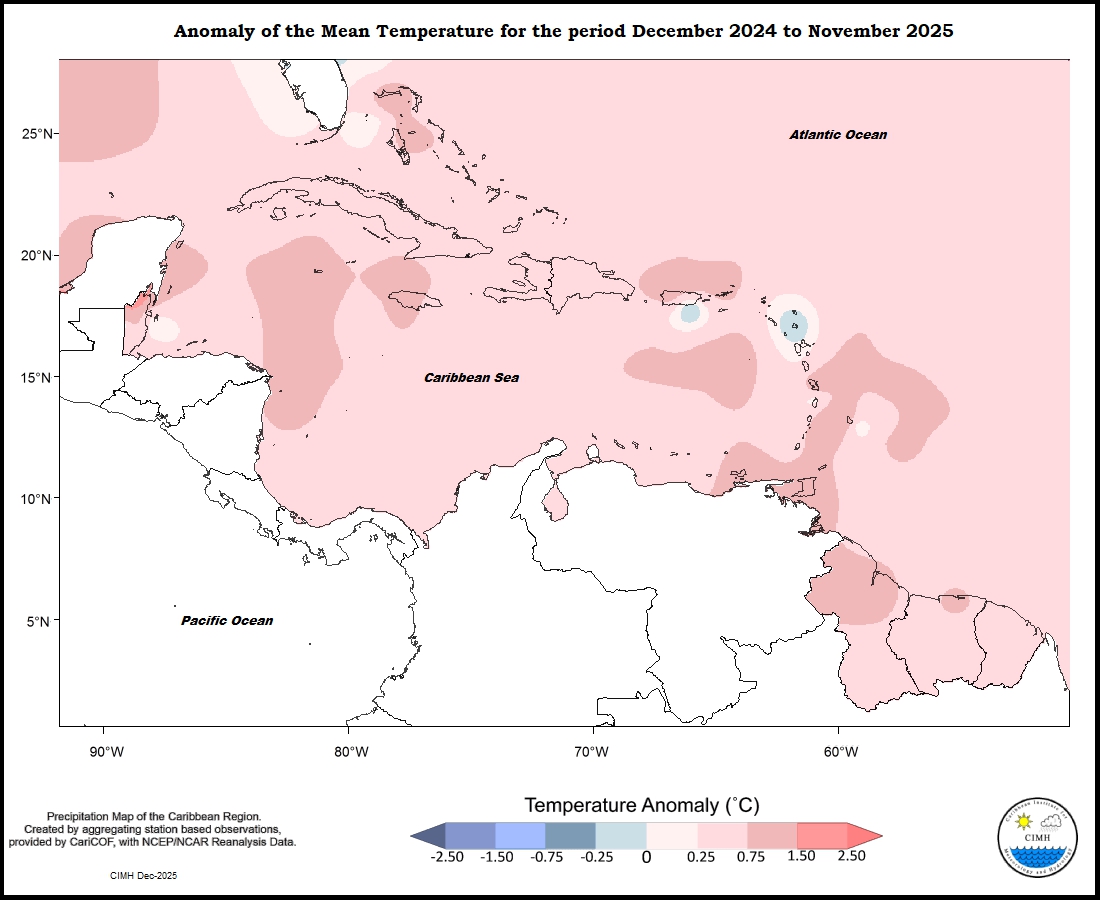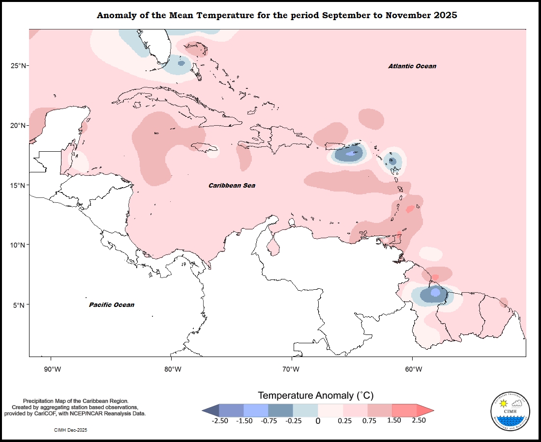 Mixed temperature conditions were experienced during the month of November throughout the eastern Caribbean. Trinidad, Grenada, Barbados and Martinique were between 0.25 to 1.50 o C warmer than average; Saint Lucia was 0 to 1.50 o C warmer; Dominica was 0 to 0.75 o C warmer; Guadeloupe and St Kitts ranged from 0.25 warmer to 0.25 o C cooler; Antigua was 0.25 to 0.75 o C cooler; St Maarten was 0.25 to 0.75 o C warmer; and St Croix from 0 to 0.75 cooler. In the Guianas, conditions ranged from 1.50 warmer in southern portions of French Guiana and Suriname to 0.75 o C cooler in northeastern parts of Guyana. Aruba was between 0.25 and 0.75 o C warmer. Puerto Rico was between 0.25 cooler to 1.50 o C warmer southeast to northwest; The Dominican Republic 0.25 to 0.75 o C warmer; Jamaica 1.50 to 0.25 o C warmer from west to east; Grand Cayman ranged from 0.25 to 0.75 o C warmer; Northern Bahamas 0.25 cooler to 1.50 o C warmer; and Belize was 0.25 warmer to 0.25 o C cooler south to north.