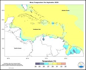 Mixed temperature anomalies prevailed in September 2025 throughout the eastern Caribbean. Trinidad, Tobago, Grenada, Saint Lucia, St Maarten and Martinique were between 0.25 to 1.50 o C warmer; Barbados was between 0.75 and 2.50 o C warmer; Dominica was between 1.50 o C warmer and 0.75 o C cooler southwest to northeast; Guadeloupe and Antigua were between 0 and 0.75 o C cooler; St Kitts was 0 to 0.75 o C warmer; St Thomas was between 0.25 and 0.75 o C cooler and St Croix was between ranged from 1.50 o C cooler to predominantly between 0.25 and 0.75 o C cooler west to east. The Guianas ranged from 1.50 o C cooler to predominantly between 0.25 and 0.75 o C warmer and to 2.50 o C warmer in southwestern Guyana. Curacao was between 0.25 and 1.50 o C warmer. Aruba was between 0 and 0.25 o C warmer. Puerto Rico was between 2.50 o C warmer to 1.50 o C cooler. The Dominican Republic was between 0 and 0.75 o C warmer. Jamaica ranged from 1.50 o C warmer to 0.75 o C cooler west to east. Grand Cayman was between 0.75 and 1.50 o C warmer. Northern Bahamas was between 0.25 o C cooler and 1.50 o C warmer. Belize was between 0.75 o C warmer to 0.75 o C cooler.
