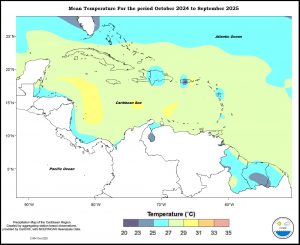 Temperature anomalies were warmer than usual for the period October 2024 to September 2025 throughout the eastern Caribbean. Trinidad was predominantly between 0.25 and 0.75 o C warmer, ranging to 1.50 o C warmer in the northeast; Tobago was between 0.75 and 1,50 o C warmer; Grenada, Martinique and St Thomas were between 0.25 and 1.50 o C warmer; Barbados was between 0 and 1.50 o C warmer; Saint Lucia and Dominica and were between 0 and 0.75 o C warmer; Guadeloupe ranged from 0.25 o C warmer to predominantly between 0 and 0.25 o C cooler; Antigua was between 0 and 0.25 o C warmer; St Kitts and St Maarten were between 0.25 o C and 0.75 o C warmer; St. Croix was between 0.25 o C cooler and 0.75 o C warmer west to east. The Guianas were between 0.25 and 1.50 o C warmer. Aruba was between 0 and 0.25 o C warmer and Curacao was between 0.25 and 0.75 o C warmer. Puerto Rico was between 0.75 o C cooler and 1.50 o C warmer. The Dominican Republic was predominantly between 0 and 0.25 o C warmer, ranging to 0.75 o C warmer in the south. Jamaica was between 1.50 o C warmer and 0.75 o C cooler west to east. Grand Cayman was between 0.25 and 0.75 o C warmer. Northern Bahamas was between 0 and 1.50 o C warmer. Belize was between 0.75 o C cooler and 2.50 o C warmer.