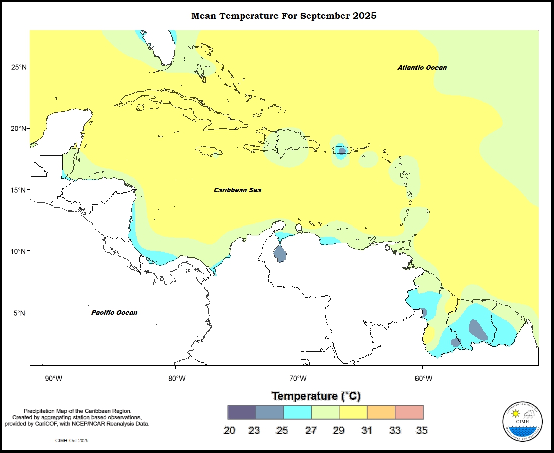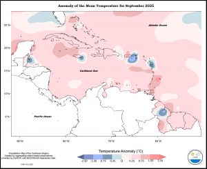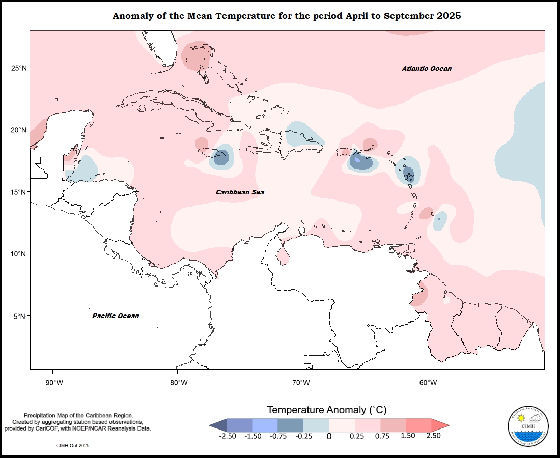 Mixed temperature anomalies were present for the period April to September 2025 throughout the eastern Caribbean. Trinidad, Tobago, Grenada, Martinique and St Maarten were between 0.25 o C and 0.75 o C warmer; Barbados was between 0 to 1.50 o C warmer; Saint Lucia was between 0 and 0.75 o C warmer; Dominica ranged from 0.75 o C warmer 0.25 o C cooler to south to north; Guadeloupe, Antigua and St. Croix were between 0 and 0.75 o C cooler; St Kitts was between 0.25 o C cooler to predominantly between 0 and 0.25 o C warmer; and St Thomas was 0.25 to predominantly between 0.75 and 1.50 o C warmer. The Guianas ranged from 0 to predominantly between 0.25 and 0.75 o C warmer, and to 1.50 o C warmer in the northwest Aruba was between 0 and 0.25 o C warmer and Curacao was between 0 and 0.75 warmer. Puerto Rico was between 0.75 o C cooler to 1.50 o C warmer. The Dominican Republic was between 0.25 o C warmer to 0.25 o C cooler south to north. Jamaica was between 1.50 o C warmer and 0.75 o C cooler west to east. Grand Cayman was between 0.25 and 0.75 o C warmer. Northern Bahamas was between 0.25 and 1.50 o C warmer. Belize was between 0.25 o C cooler to and 1.50 o C warmer southeast to northwest.