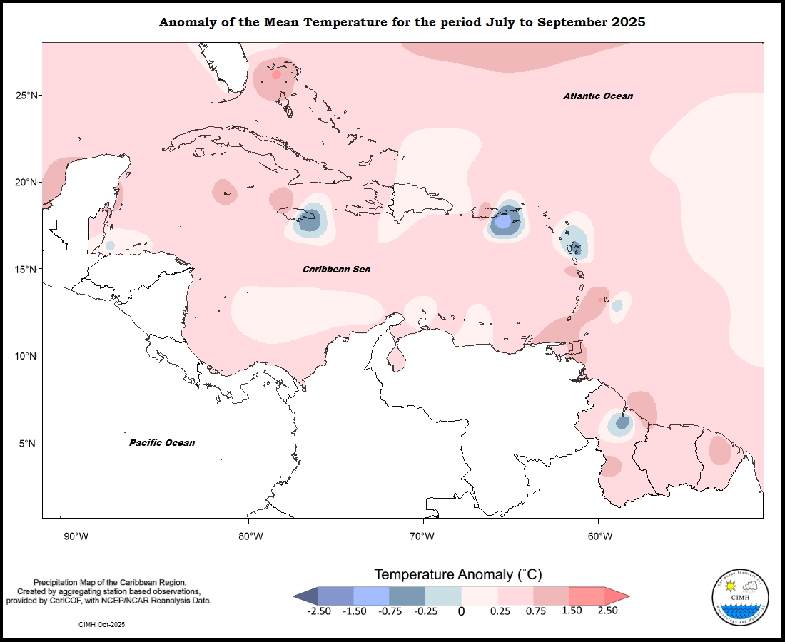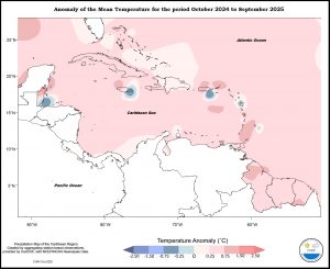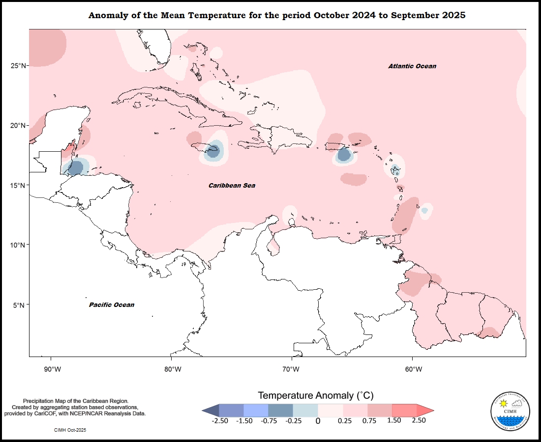 Temperature anomalies were warmer than usual for the period October 2024 to September 2025 throughout the eastern Caribbean. Trinidad was predominantly between 0.25 and 0.75 o C warmer, ranging to 1.50 o C warmer in the northeast; Tobago was between 0.75 and 1,50 o C warmer; Grenada, Martinique and St Thomas were between 0.25 and 1.50 o C warmer; Barbados was between 0 and 1.50 o C warmer; Saint Lucia and Dominica and were between 0 and 0.75 o C warmer; Guadeloupe ranged from 0.25 o C warmer to predominantly between 0 and 0.25 o C cooler; Antigua was between 0 and 0.25 o C warmer; St Kitts and St Maarten were between 0.25 o C and 0.75 o C warmer; St. Croix was between 0.25 o C cooler and 0.75 o C warmer west to east. The Guianas were between 0.25 and 1.50 o C warmer. Aruba was between 0 and 0.25 o C warmer and Curacao was between 0.25 and 0.75 o C warmer. Puerto Rico was between 0.75 o C cooler and 1.50 o C warmer. The Dominican Republic was predominantly between 0 and 0.25 o C warmer, ranging to 0.75 o C warmer in the south. Jamaica was between 1.50 o C warmer and 0.75 o C cooler west to east. Grand Cayman was between 0.25 and 0.75 o C warmer. Northern Bahamas was between 0 and 1.50 o C warmer. Belize was between 0.75 o C cooler and 2.50 o C warmer.
