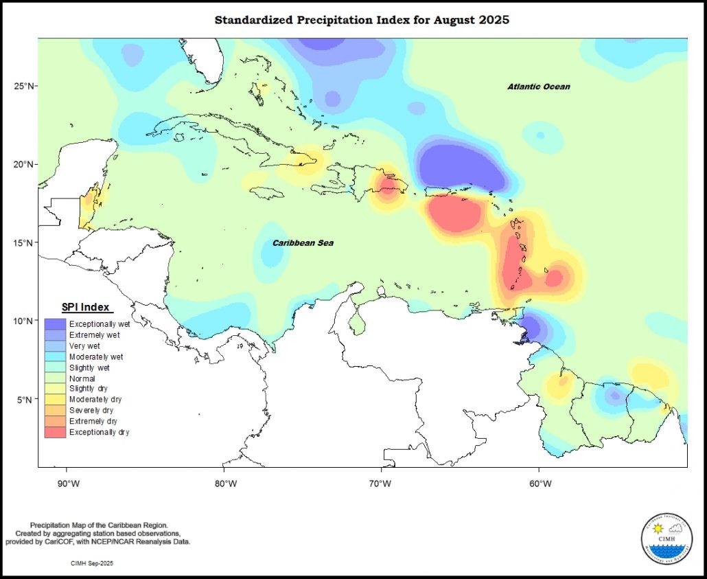 During the month of August, conditions were mostly normal to below normal throughout the eastern Caribbean. Trinidad was exceptionally wet to moderately dry southeast to northwest; Tobago normal to moderately dry; Grenada, St Vincent exceptionally dry; Barbados extreme to moderately dry; Saint Lucia moderate to exceptionally dry; Martinique and Dominica exceptional to extremely dry; Guadeloupe predominantly extreme to severely dry; Antigua and St Kitts slightly dry to mostly normal; St Maarten normal to moderately wet; Anguilla moderate to exceptionally wet and St Thomas mostly normal to slightly wet. In the Guianas, conditions were mostly normal ranging to severely dry in northeastern Guyana and French Guiana and to extremely wet in northeastern Suriname. Curacao was normal. Puerto Rico ranged from exceptionally dry in the south to exceptionally wet in the north. The Dominican Republic ranged from normal to exceptionally dry west to east. Jamaica was mostly normal, but slightly dry in the west. Grand cayman was slightly wet. Cuba was mostly normal ranging to moderately wet in the west and to moderately dry in the east. Northern Bahamas was predominantly normal ranging to slightly dry and Belize was normal to severely dry.