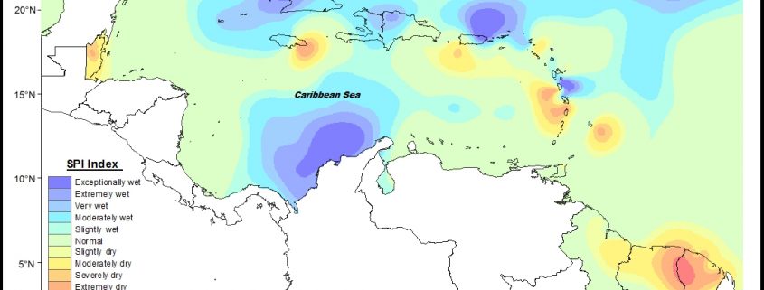 Mixed conditions were experienced over the three month period across the eastern Caribbean. Trinidad was extremely wet to slightly dry; Tobago and St Thomas slightly wet to normal; Grenada , St Maarten and Anguilla normal; Barbados extremely wet to normal; St Vincent severe to extremely dry; Saint Lucia exceptional to moderately dry; Martinique slightly dry to predominantly normal; Dominica normal to very wet; Guadeloupe very wet to moderately dry; Antigua and St Croix slight to moderately dry and St Kitts moderately dry. In the Guianas, conditions ranged from extremely wet in southwest Guyana to extremely dry in the vicinity of the central Suriname/French Guiana border. Aruba was moderate to slightly dry. Puerto Rico was normal to very wet. The Dominican Republic was extremely wet in the west to slightly dry in eastern areas. Jamaica was slight to very wet west to east. Grand Cayman was moderately wet. Cuba ranged from normal in the west to extremely wet in east central areas. Northern Bahamas was normal to moderately dry and Belize was predominantly normal with slightly wet conditions in central areas and slightly dry areas in the west.