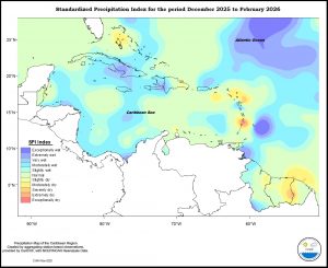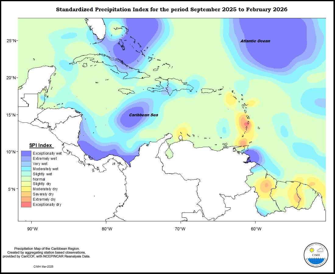 Mixed conditions were experienced across the islands of the eastern Caribbean during the month of February. Trinidad was predominantly normal to slightly dry; Tobago, Grenada and St Croix normal; Barbados and St Kitts normal to moderately dry; St Vincent mostly moderate to severely dry; Saint Lucia moderate to extremely dry; Martinique severely dry to extremely wet south to north; Dominica severely dry to exceptionally wet; Guadeloupe exceptionally wet to normal; Antigua predominantly slightly wet to normal; St Maarten very wet to normal; Anguilla moderately wet to normal and St Thomas moderate to extremely wet. Conditions in the Guianas ranged from normal in most of Guyana and parts of Suriname to exceptionally dry in the vicinity of the northern Suriname/French Guiana border. Aruba was normal. Puerto Rico ranged from moderately dry in the southwest to exceptionally wet in the northeast. The Dominican Republic ranged from extremely wet to normal from northwest to east. Jamaica was moderately wet to extremely dry west to east. Grand Cayman was very wet. Cuba ranged from extremely dry in western areas to exceptionally wet in east central areas. Northern Bahamas ranged from normal to extremely dry and Belize from mostly moderate to extremely dry in central areas.