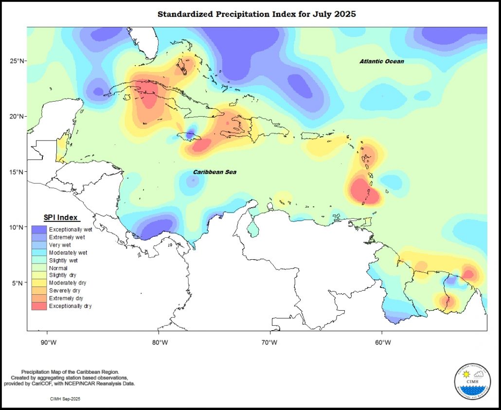 Apart from Tobago and Barbados that were mostly normal to slightly wet, conditions throughout the eastern Caribbean were predominantly normal to below normal during the month of July. Trinidad and St Thomas were normal to slightly dry; Grenada moderate to exceptionally dry; St Vincent exceptionally dry; Saint Lucia and Martinique severely dry to normal; Dominica moderate to extremely dry; Guadeloupe and Antigua severe to extremely dry; St. Kitts normal; St Maarten moderate to slightly dry and Anguilla moderately dry to normal. In the Guianas, conditions ranged from extremely wet to exceptionally dry. Curacao was mostly slight to moderately dry. Puerto Rico was predominantly normal ranging to moderately dry in the southeast. The Dominican Republic ranged from normal in central areas to severely dry in the west and slightly dry in the east. Jamaica ranged from exceptionally wet in central areas to exceptionally dry in the east. Grand Cayman was severe to extremely dry. Cuba was exceptionally dry in west central areas ranging to extremely wet in the west and to extremely dry in the extreme east. Northern Bahamas ranged from extremely dry to moderately wet and Belize was moderately dry to normal.